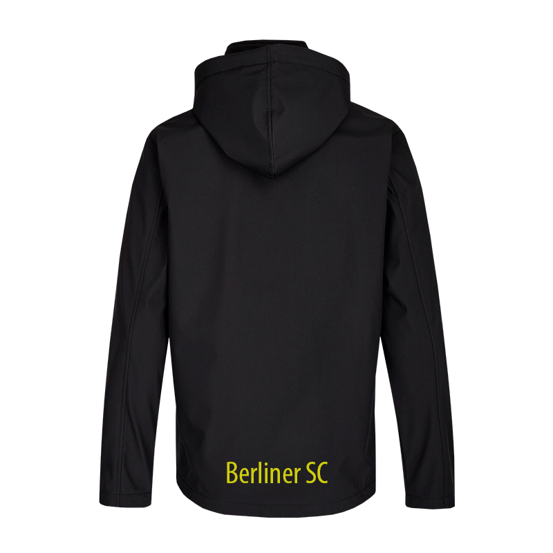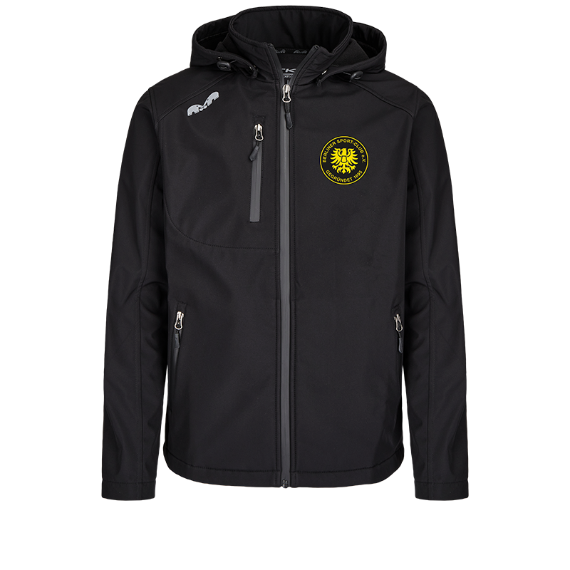 Wetterfeste Softshelljacke für Herren mit modernem Schnitt. Wasser- und windabweisende Beschichtung. Die Jacke verfügt über einen Frontreißverschluss und zwei Reißverschlusstaschen und hat eine abnehmbare Kapuze.